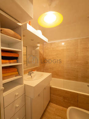 Badezimmer - Kleiderkammer - Regal - Schrank - Wandschrank - Badewanne - Föhn - Sink - Kleidertrockner-Heizkörper