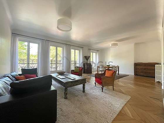 Boulevard Saint Michel, 5ème, en face des Jardins du Luxembourg, au 1er étage avec ascenseur d'un bel immeuble haussmanien avec gardien, un appartement familial de standing de 133 m2 meublé, traversant, composé d'une grande entrée, un double séjour avec nombreuses fenêtres et vue dégagée sur Le luxembourg, une suite parentale avec espace bureau, salle de douche et toilettes séparées, deux chambres, une salle de bains avec toilettes. Cuisine séparée.
