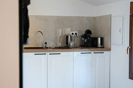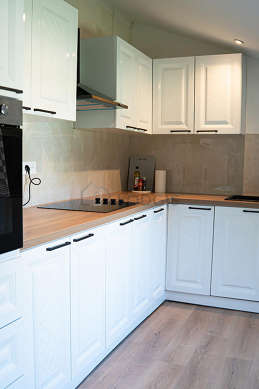 This apartment consists of kitchen with wooden floor and all the necessary equipment for your daily life: hob, refrigerator, oven, extractor hood, cupboard.