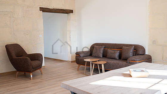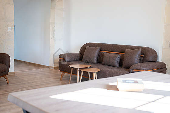 Living roomThis apartment consists of a living room with wooden floor and its windows. This living room is furnished and equipped for a comfortable stay: sofa, dining table, coffee table.