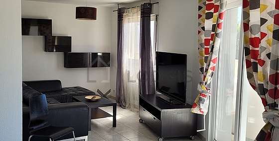 This apartment consists of a living room its windows. This living room is furnished and equipped for a comfortable stay.