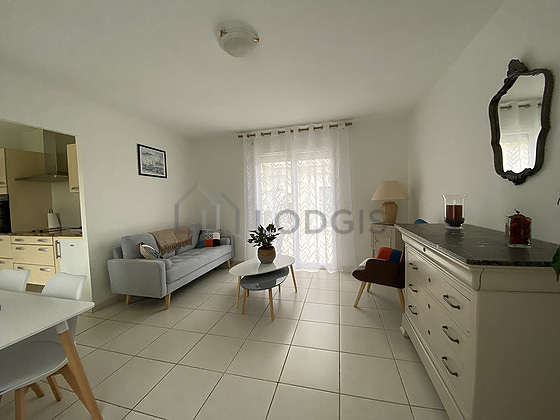 Living roomThis apartment consists of a beautiful living room with tile floor and its windows. This very quiet living room is furnished and equipped for a comfortable stay: sofa, dining table, coffee table, storage space, 1 chair(s).
