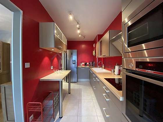 This apartment consists of great kitchen with tile floor and all the essential equipment for your daily life: hob, refrigerator, freezer, oven, microwave oven, freezer, extractor hood, kettle, coffee-maker, dining table, cupboard, crockery, soup plates, dessert plates, plates, bowl, casserole dish, cooking knives, bread knife, lid, cutlery, wooden spoon, hot plate, peeler, drying up stand, salad mixer, airer, whisk, ladle, cake tin, mugs, tin opener, sieve, chopping board, work surface, baking dish, stove, bin, grater, salad mixer, coffee cups, tea cups, cork screw, water glass, wine glass.
