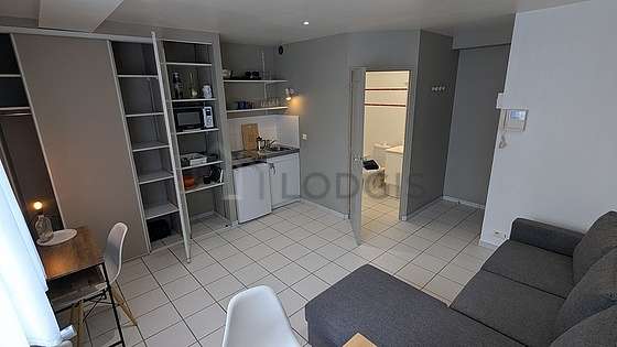 Living roomThis apartment consists of a fabulous living room with tile floor and its windows. This very quiet living room is furnished and equipped for a comfortable stay: dining table, desk, 1 chair(s)1 sofabed(s) of 110cm.