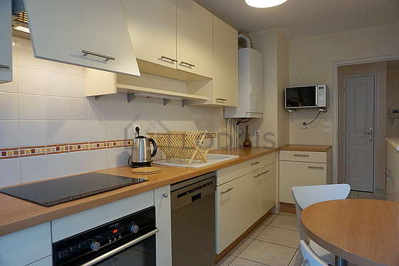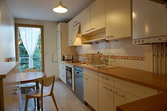This apartment is equipped with a great bathroom. This bathroom is furnished with all the equipment you need for a comfortable stay: storage space, separate shower, hair-dryer, airer, sink, mirror, bin, towel drying radiator, ventilator. The toilets are separated from the bathroom and located in an independant room.