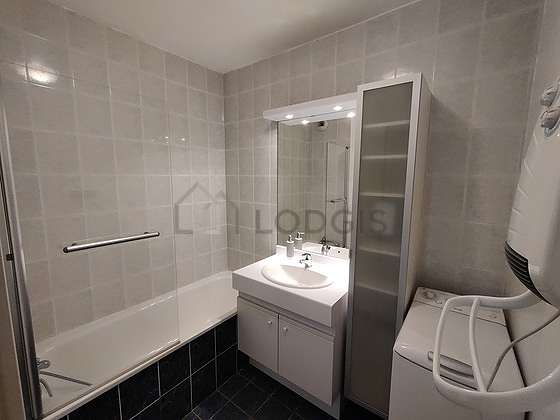 This apartment is equipped with a bathroom. This bathroom is furnished with all the equipment you need for a comfortable stay: cupboard, bath tub, sink, mirror. The toilets are separated from the bathroom and located in an independant room.