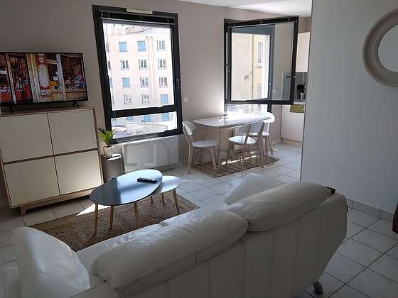 Living roomThis apartment consists of a fabulous living room with tile floor and its double-glazed windows. This very quiet living room is furnished and equipped for a comfortable stay: tv, quilt, refrigerator, sofa, 1 armchair(s), dining table, wardrobe, shelves, closet, storage space, sideboard, cupboard, crockery, 1 chair(s), stool, airer, tv stand, mirror, coat stand, bin, set of tables, carpet1 murphy bed(s) of 140cm.