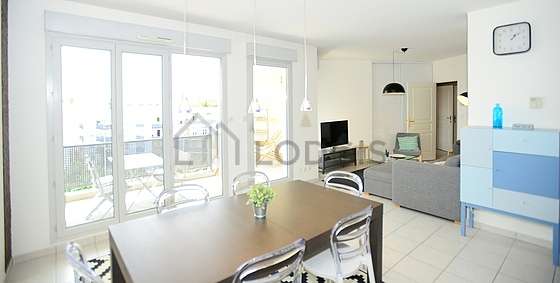 This apartment consists of a living room its windows. This living room is furnished and equipped for a comfortable stay.