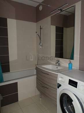 This apartment is equipped with a bathroom. This bathroom is furnished with all the equipment you need for a comfortable stay: cupboard, bath tub, sink, towel drying radiator. The toilets are separated from the bathroom and located in an independant room.