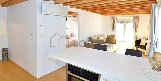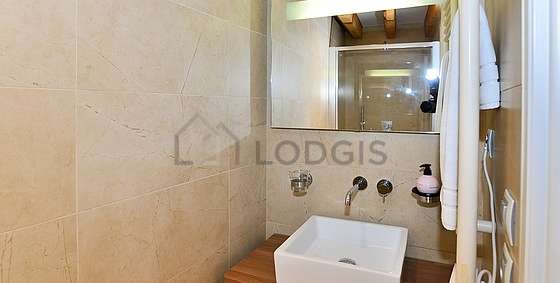 This apartment is equipped with a bathroom. This bathroom is furnished with all the equipment you need for a comfortable stay: shelves, separate shower, sink, towel drying radiator. The toilets are separated from the bathroom and located in an independant room.