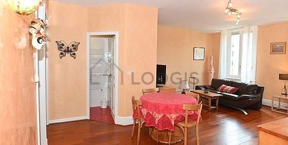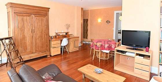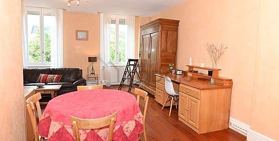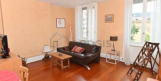 Living roomThis apartment consists of a living room with wooden floor and its double-glazed windows. This living room is furnished and equipped for a comfortable stay: tv, sofa, dining table, coffee table, desk, 1 chair(s).