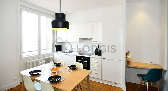 This apartment consists of kitchen close to the living room with wooden floor and all the essential equipment for your daily life: hob, freezer, oven, freezer, extractor hood, iron, vacuum cleaner, toaster, kettle, coffee-maker, cupboard, crockery.