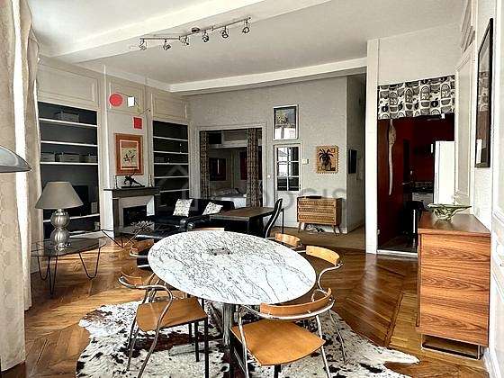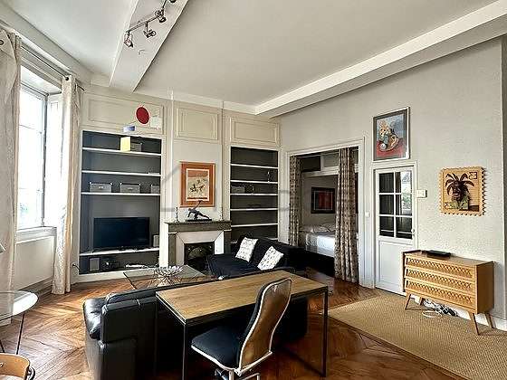 Living roomThis apartment consists of a living room with wooden floor and its double-glazed windows. This living room is furnished and equipped for a comfortable stay: tv, sofa, dining table, desk, 1 chair(s).