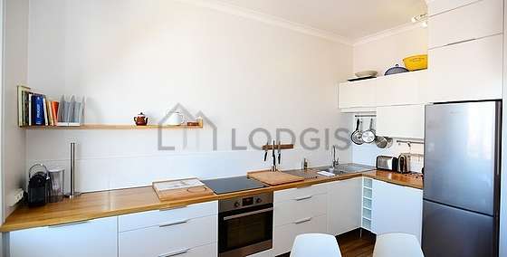 This apartment consists of kitchen close to the living room with wooden floor and all the necessary equipment for your daily life: hob, refrigerator, oven, extractor hood, toaster, kettle, coffee-maker, dining table, cupboard, crockery, 1 chair(s).