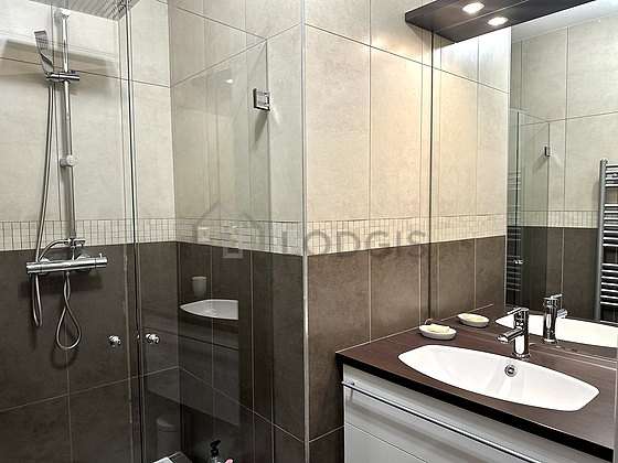 This apartment is equipped with a bathroom. This bathroom is furnished with all the equipment you need for a comfortable stay: separate shower, mirror, towel rack, towel drying radiator, ventilator. The toilets are separated from the bathroom and located in an independant room.