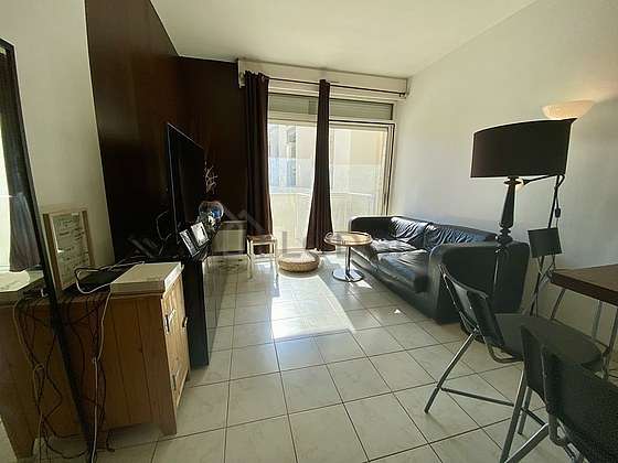 This apartment consists of a living room its windows. This living room is furnished and equipped for a comfortable stay.