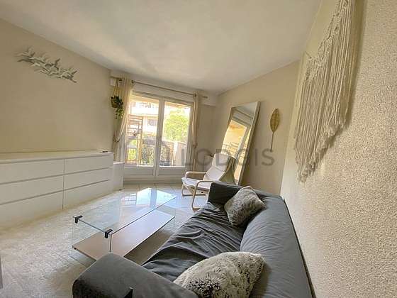 This triplex consists of a living room with tile floor view on garden. This quiet living room is furnished and equipped for a comfortable stay: sofa, coffee table, 1 chair(s).