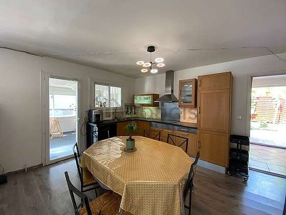This house consists of great kitchen with wooden floor and all the essential equipment for your daily life: hob, refrigerator, freezer, microwave oven, extractor hood, coffee-maker, dining table, crockery, bin.
