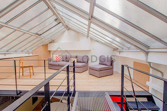 This triplex consists of a beautiful living room with wooden floor and its windows and view on courtyard. This very quiet living room is furnished and equipped for a comfortable stay: tv, sofa, 1 armchair(s), coffee table, shelves1 sofabed(s) of 140cm.