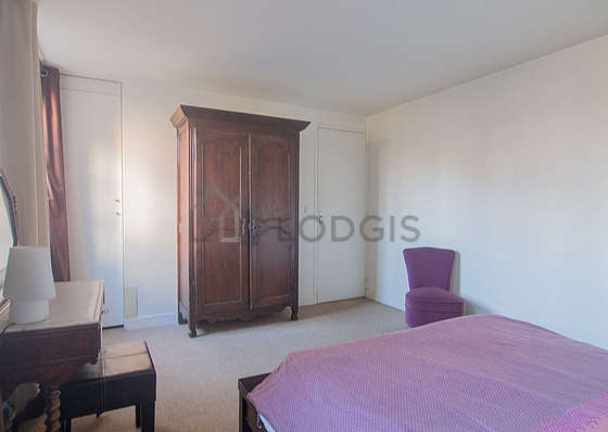 This apartment consists of a attractive living room with wooden floor and its windows and view on courtyard. This very quiet living room is furnished and equipped for a comfortable stay: tv, sofa, 2 armchair(s), coffee table, shelves.