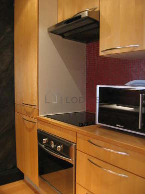 This apartment consists of great kitchen with tile floor and all the essential equipment for your daily life: hob, refrigerator, freezer, oven, microwave oven, freezer, coffee-maker, cupboard, crockery, stool, bar.