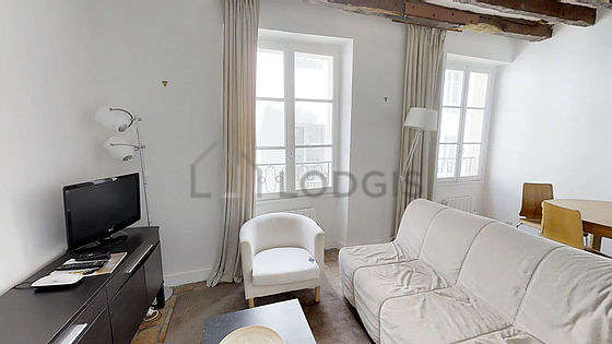 This apartment consists of a wonderful living room with tile floor and its windows and view on road. This very quiet living room is furnished and equipped for a comfortable stay: tv, 2 armchair(s), dining table, coffee table, wardrobe, cupboard, 4 chair(s)1 sofabed(s) of 140cm.