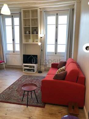 Living roomThis apartment consists of a pleasant living room with linoleum floor and its double-glazed windows and view on road. This quiet living room is furnished and equipped for a comfortable stay: tv, linen, quilt, dining table, coffee table, desk, wardrobe, shelves, cupboard, 3 chair(s), stool, bedside table1 sofabed(s) of 140cm.