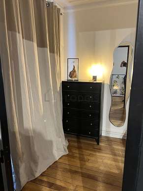 This apartment consists of a attractive living room with wooden floor and its windows and view on courtyard. This very quiet living room is furnished and equipped for a comfortable stay: tv, sofa, 1 armchair(s), dining table, coffee table, wardrobe, shelves, cupboard, 2 chair(s).