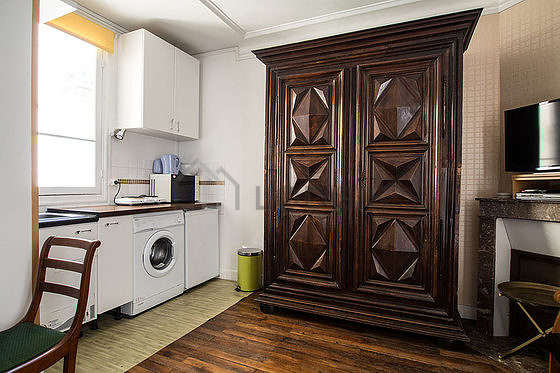 This apartment consists of a pleasant living room with wooden floor and its windows and view on courtyard. This very quiet living room is furnished and equipped for a comfortable stay: tv, linen, quilt, sofa, dining table, closet, 2 chair(s)1 bed(s) of 140cm.