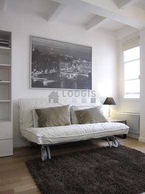 This apartment consists of a charming living room with wooden floor and its double-glazed windows and view on courtyard. This very quiet living room is furnished and equipped for a comfortable stay: tv, linen, quilt, 1 armchair(s), dining table, desk, wardrobe, shelves, cupboard, 2 chair(s), stool, bedside table1 sofabed(s) of 160cm.