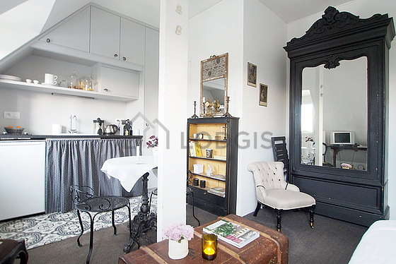 This apartment consists of a beautiful living room with coco floor and its double-glazed windows and view on courtyard. This quiet living room is furnished and equipped for a comfortable stay: tv, linen, quilt, 1 armchair(s), dining table, coffee table, wardrobe, shelves, closet, cupboard, 2 chair(s), stool1 sofabed(s) of 140cm.