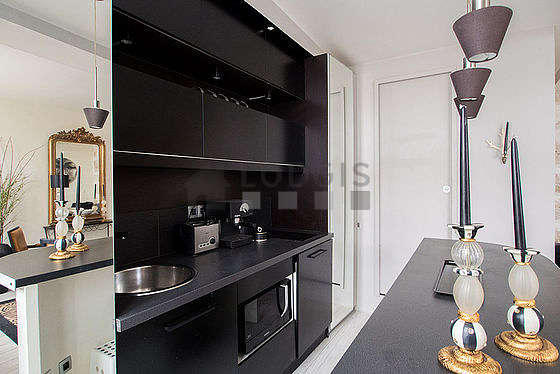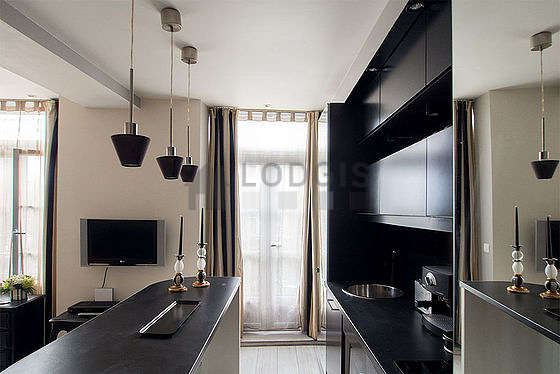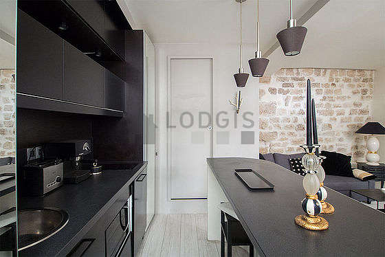 This apartment consists of a fabulous living room with wooden floor and its double-glazed windows and view on courtyard. This quiet living room is furnished and equipped for a comfortable stay: tv, linen, quilt, 2 armchair(s), coffee table, wardrobe, shelves, storage space, exposed bricks1 sofabed(s) of 140cm.