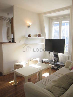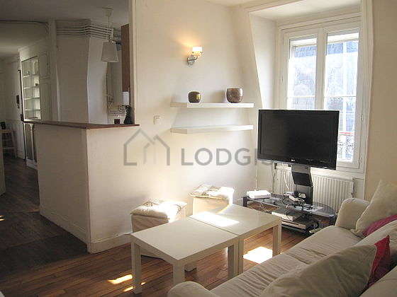 This apartment consists of a pleasant living room with wooden floor and its double-glazed windows and view on courtyard. This very quiet living room is furnished and equipped for a comfortable stay: tv, sofa, dining table, coffee table, shelves, cupboard, 4 chair(s)1 sofabed(s) of 140cm.