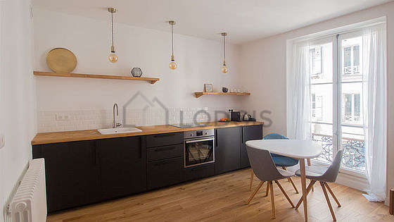 This apartment consists of great kitchen close to the living room with wooden floor and all the necessary equipment for your daily life: hob, refrigerator, oven, freezer, kettle, coffee-maker, shelves, cupboard, crockery, stool.
