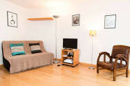 This apartment consists of a living room with wooden floor and its double-glazed windows and view on courtyard. This very quiet living room is furnished and equipped for a comfortable stay: tv, linen, quilt, sofa, 1 armchair(s), dining table, wardrobe, shelves, cupboard, 3 chair(s), stool, bedside table, floor lamp, tv stand, curtains, painting1 bed(s) of 140cm.