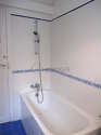 This apartment consists of a living room with wooden floor and its windows and view on courtyard. This quiet living room is furnished and equipped for a comfortable stay: tv, sofa, coffee table, wardrobe, bookcase, sideboard, cupboard.
