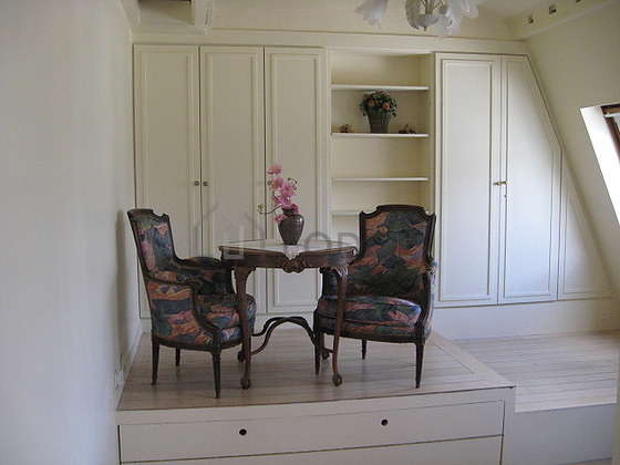 This apartment consists of a charming living room with wooden floor and its double-glazed windows and view on courtyard. This very quiet living room is furnished and equipped for a comfortable stay: tv, sofa, dining table, desk, cupboard, 3 chair(s).