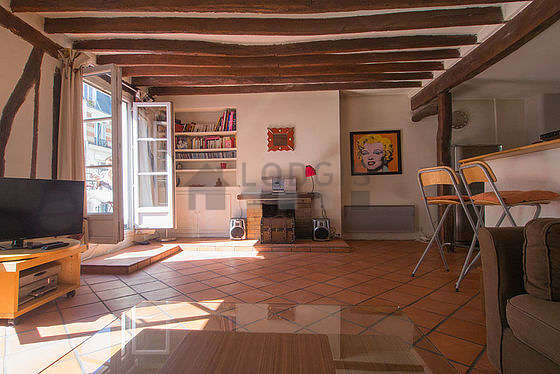 Living roomThis apartment consists of a attractive living room with tile floor and its double-glazed windows with balcony and view on road. This living room is furnished and equipped for a comfortable stay: tv, sofa, 2 armchair(s), coffee table, desk, bookcase, stool.