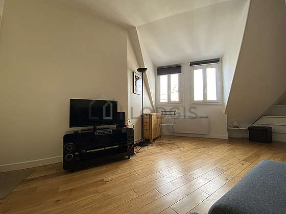 This apartment consists of a charming living room with wooden floor and its double-glazed windows. This quiet living room is furnished and equipped for a comfortable stay: tv, dining table, coffee table, wardrobe, shelves, storage space, 2 chair(s)1 murphy bed(s) of 140cm.