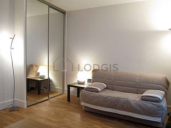 This apartment consists of a pleasant living room with wooden floor and its double-glazed windows and view on courtyard. This very quiet living room is furnished and equipped for a comfortable stay: tv, linen, quilt, dining table, coffee table, wardrobe, storage space, cupboard, 4 chair(s)1 sofabed(s) of 160cm.