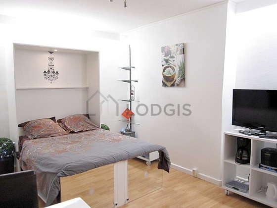 This apartment consists of a living room with wooden floor and its double-glazed windows and view on courtyard. This very quiet living room is furnished and equipped for a comfortable stay: tv, linen, quilt, dining table, shelves, closet, 2 chair(s), stool1 murphy bed(s) of 140cm.