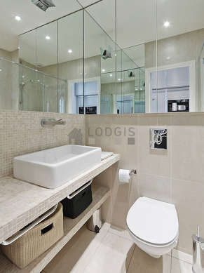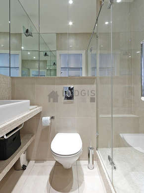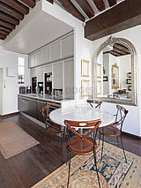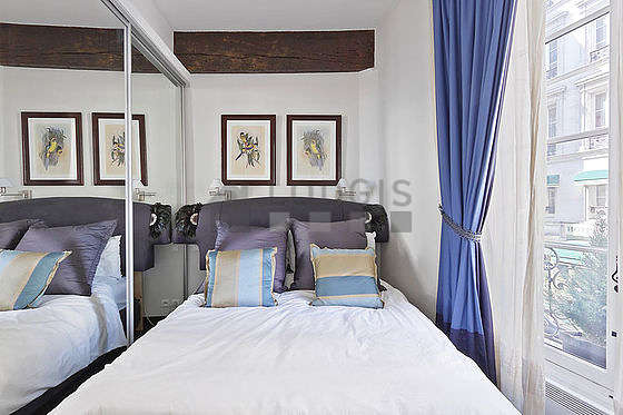 This apartment consists of a beautiful living room with wooden floor and its double-glazed windows and view on courtyard. This quiet living room is furnished and equipped for a comfortable stay: sofa, 1 armchair(s), dining table, coffee table, storage space, 4 chair(s).