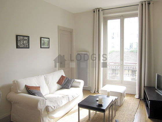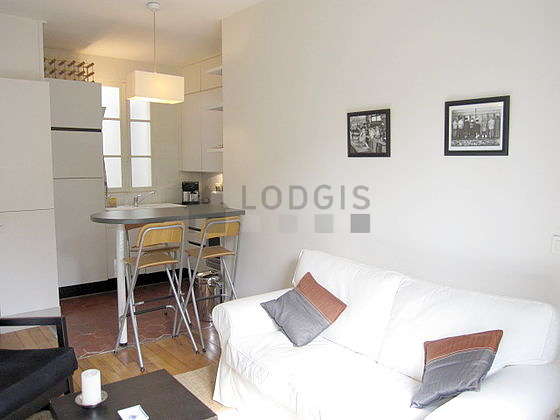 This apartment consists of a pleasant living room with wooden floor and its windows and view on courtyard. This quiet living room is furnished and equipped for a comfortable stay: tv, sofa, 1 armchair(s), coffee table, shelves.