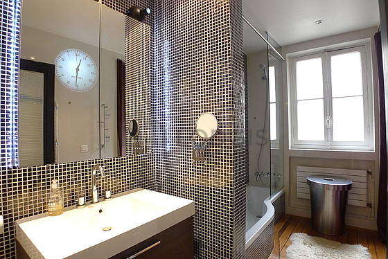 This apartment is equipped with a great bathroom and bright with windows. This bathroom is furnished with all the equipment you need for a comfortable stay: bath towels, iron, shelves, cupboard, bath tub, hair-dryer, airer, sink, bin. The toilets are separated from the bathroom and located in an independant room.