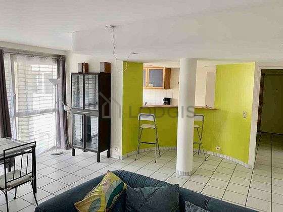 This apartment consists of a attractive living room with tile floor and its double-glazed windows and view on courtyard. This very quiet living room is furnished and equipped for a comfortable stay: tv, 2 armchair(s), dining table, coffee table, shelves, 6 chair(s).