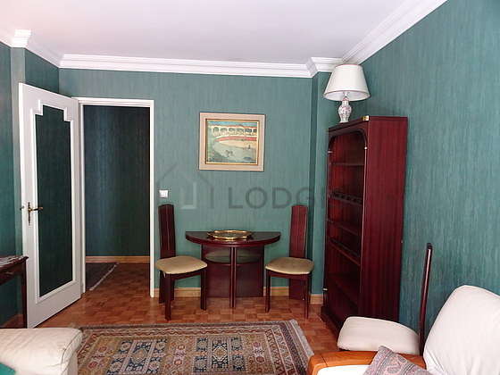 This apartment consists of a living room with wooden floor and its windows with balcony and view on road. This quiet living room is furnished and equipped for a comfortable stay: sofa, dining table, coffee table, shelves, 2 chair(s).