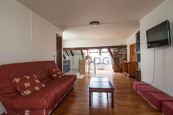 Living roomThis apartment consists of a attractive living room with wooden floor and its double-glazed windows and view on road. This very quiet living room is furnished and equipped for a comfortable stay: tv, dining table, coffee table1 sofabed(s) of 140cm.