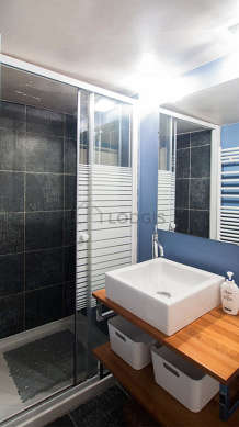 This apartment is equipped with a pleasant bathroom. This bathroom is furnished with all the equipment you need for a comfortable stay: bath towels, shelves, cupboard, separate shower, hair-dryer, towel drying radiator. The toilets are separated from the bathroom and located in an independant room.
