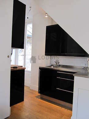This apartment consists of a charming living room with wooden floor and its double-glazed windows and view on road. This quiet living room is furnished and equipped for a comfortable stay: 1 armchair(s), dining table, coffee table, stool1 sofabed(s) of 120cm.