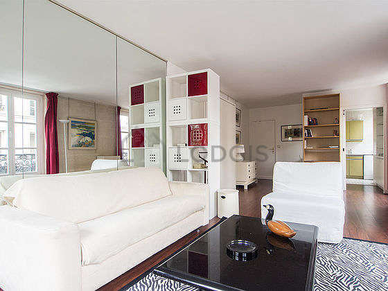 This apartment consists of a charming living room with wooden floor and its windows and view on road. This quiet living room is furnished and equipped for a comfortable stay: tv, 1 armchair(s), coffee table, wardrobe, storage space, cupboard1 sofabed(s) of 140cm.